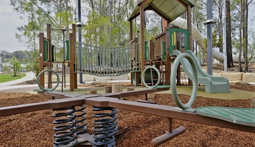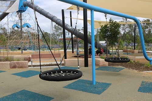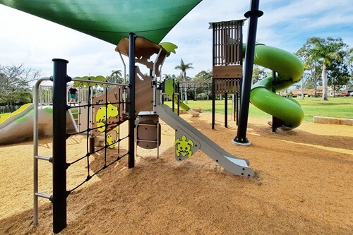 There are climbing objects for little ones and tall musical chimes. There’s also spinning hand objects, clear shapes to look through, and a sand play area with little diggers to sit and dig in the sand. This Brisbane playground features all the standard equipment, including multiple one and two-person see-saws and spinning seats, a four swing set, including one baby swing and one for all abilities.