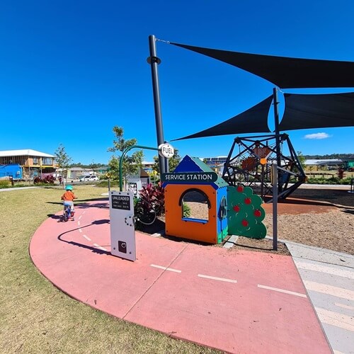 There are two playgrounds, each aimed at differing age groups. There is a giant fort aimed at bigger children, with so many climbing and exploring options. The fort is mostly covered, so lots of shade, with additional shade sails nearby. There is also a flying fox, giant climbing net, swings, bike paths, exploration paths, and even a half basketball court. The playground for younger children is fully fenced with two smaller forts. There’s also a sandpit is also within the fenced area, with a sand table and push-button water tap to help with the sand creations. Toddler swings, bouncers, and safari car seat all add to the fun to be had here.