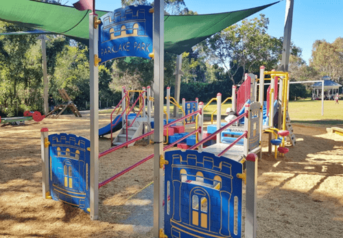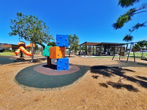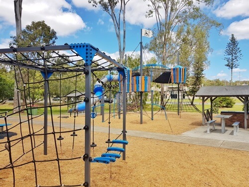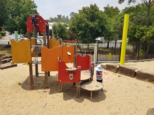 Toilets (with baby change) are close by and accessible. Shaded picnic shelters and BBQs surround the playground, and there’s plenty of grassy space for running or kicking a ball. A large car park is adjacent, and the park is right next to Capalaba’s shopping centre if you need to grab lunch or extra wipes.
