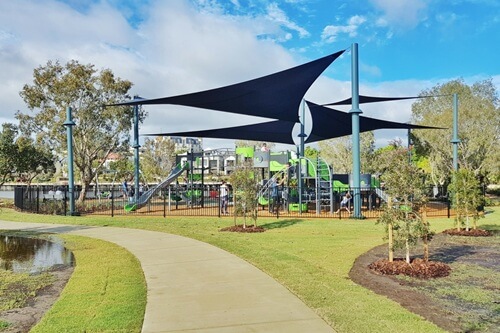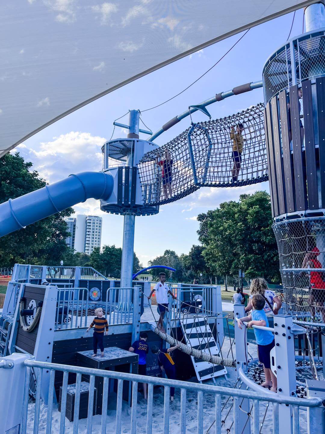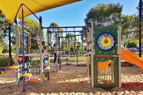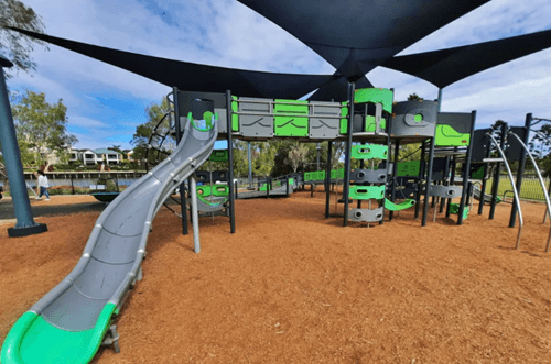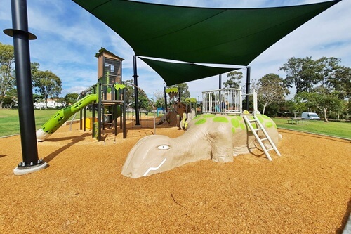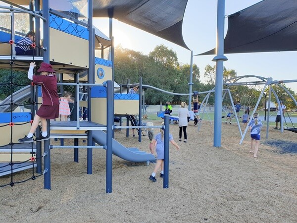 Many of the play structures are covered by shade sails, a huge bonus on hot or bright days. No hot slides or overheated kiddos here – it’s a true “Sun Smart” playground.