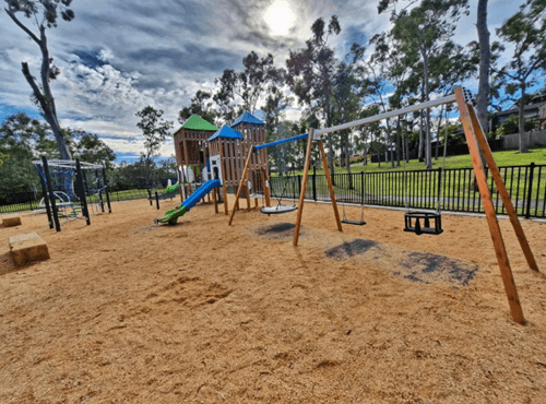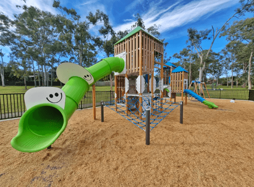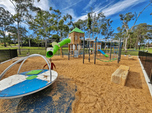 Denham Boulevard Park – is a quiet neighbourhood playground in Redland Bay. It may not feature the giant towers of bigger parks, but it shines with toddler-friendly design. Families with little ones will find it a safe and inviting place to