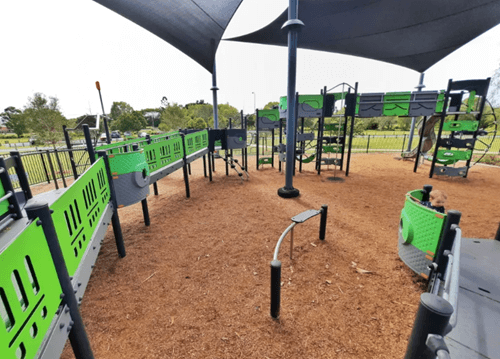 Additional features include accessible toilets, mostly shaded areas, a wheelchair-accessible carousel, a short bike and scooter track, picnic shelters, electric BBQs, bench seating, a kick-around area, and ample on and off-street parking.