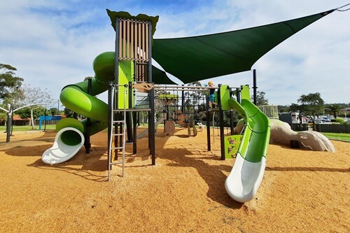 Additional amenities include toilets, shade sails, and picnic tables, making it a well-equipped destination for family outings.