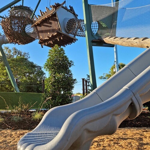 Over 20 developmental activities between the main and toddler playgrounds promote educational play in a fun outdoor setting. The park also emphasises social play with shared swing circles, rotating net climbers, and multi-track flying foxes, encouraging greater participation. The parklands are wheelchair and pram friendly, with accessible pathways connecting all areas. The seated playground equipment, including an adaptive swing, see-saw, and net climber, are designed for inclusivity.