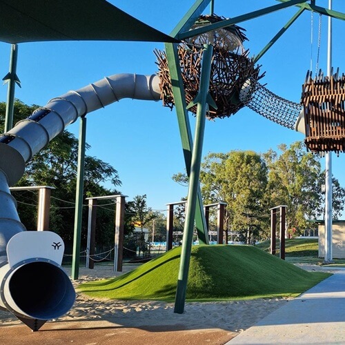 Check out Faye Carr Park in Ripley, a rocket ship-themed playground designed for the whole community. The standout feature is the impressive trio of red and green pods, which have become a landmark of the Ecco Ripley development since its opening in 2018. These custom-designed pods by Playscape Creations are a first for Australia, offering sensory delights like cogs, steering equipment, and rainbow spinning wheels, all connected by a bridge. The exterior is just as engaging with ladders, slides, staircases, and fireman poles for endless fun.